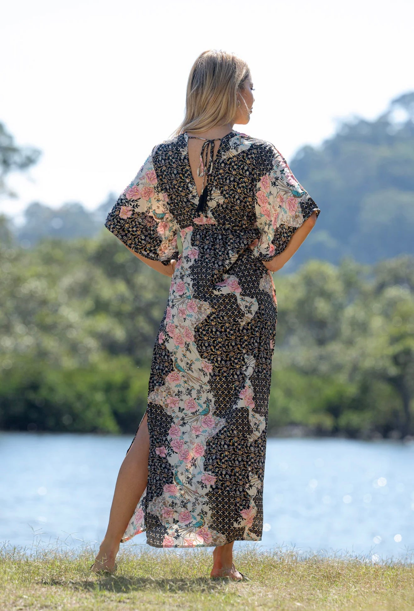 The Amirah Venus Dress!! Amazing tones of Vanilla, Black, Pink, Turquoise and splashes of Gold. Silk Blend Fabric.