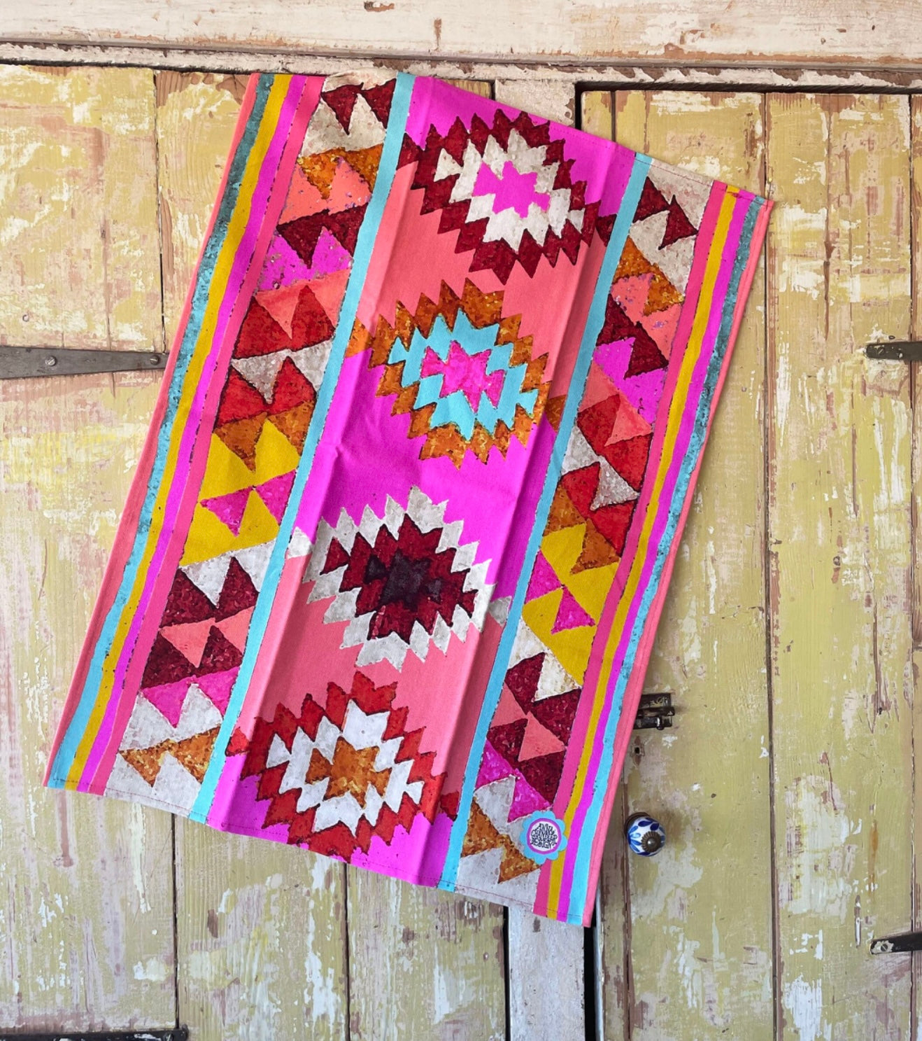 Mystical and magical Mojave is a vibrant tribal-influenced print inspired by the famous woven blankets of New Mexico. Pink and apricot, a flash of bright aqua and mustard yellow are softened by the addition of earthy shades of terracotta and burnt sienna.